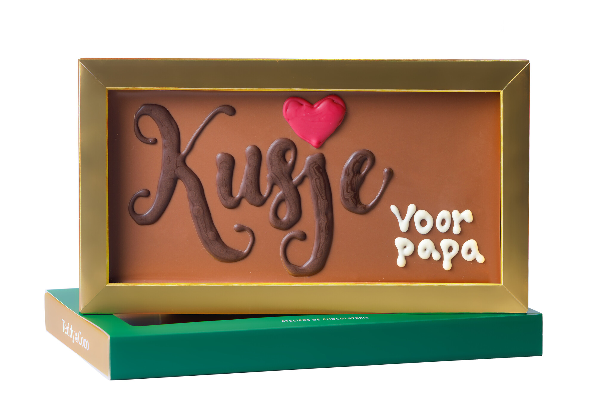 Productinformatie van chocoladereep met tekst: Kusje voor papa