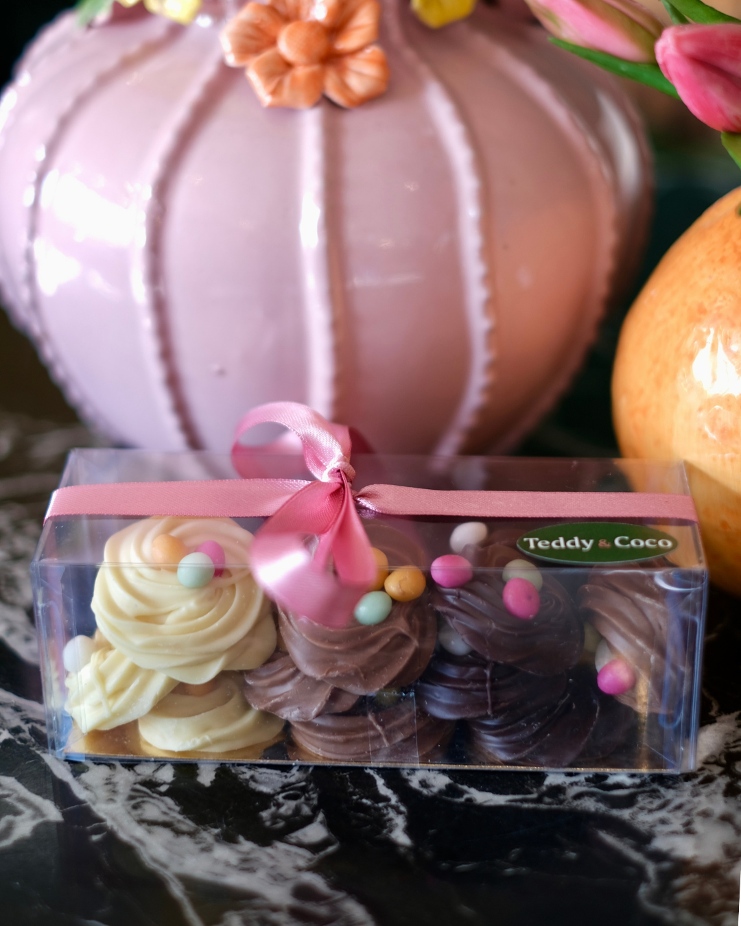 Handgespoten chocolade nestjes in diverse smaken! Verpakt in een luxe cadeaudoosje.