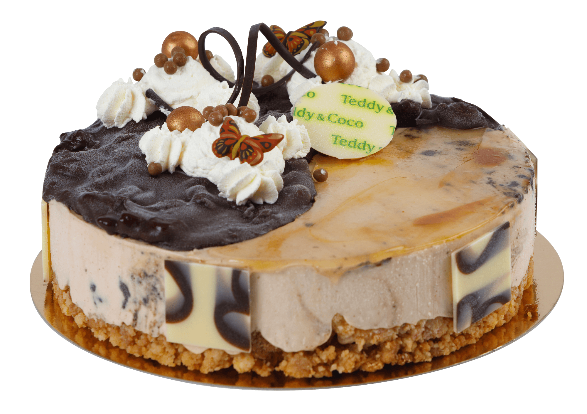 Deze luxe ijstaart heeft een bodem van huisgemaakte cookie caramel, heeft een vulling van hazelnootschuim en Teddy & Coco ijs van chocolade, caramel en hazelnoten. Geschikt voor 6-8 personen.