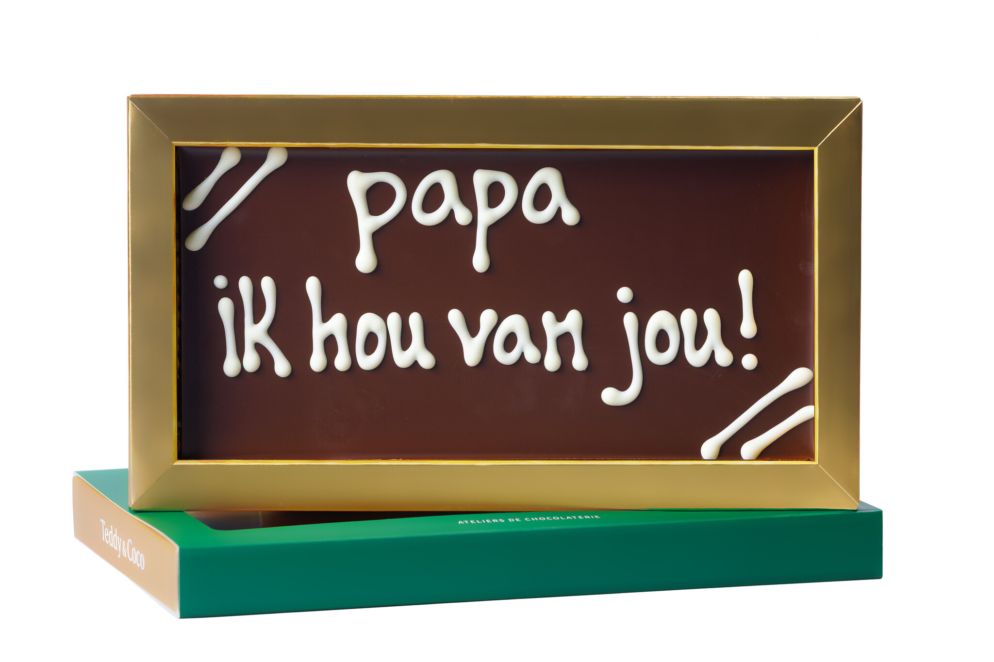 Productinformatie van chocoladereep met tekst: Papa ik hou van jou!